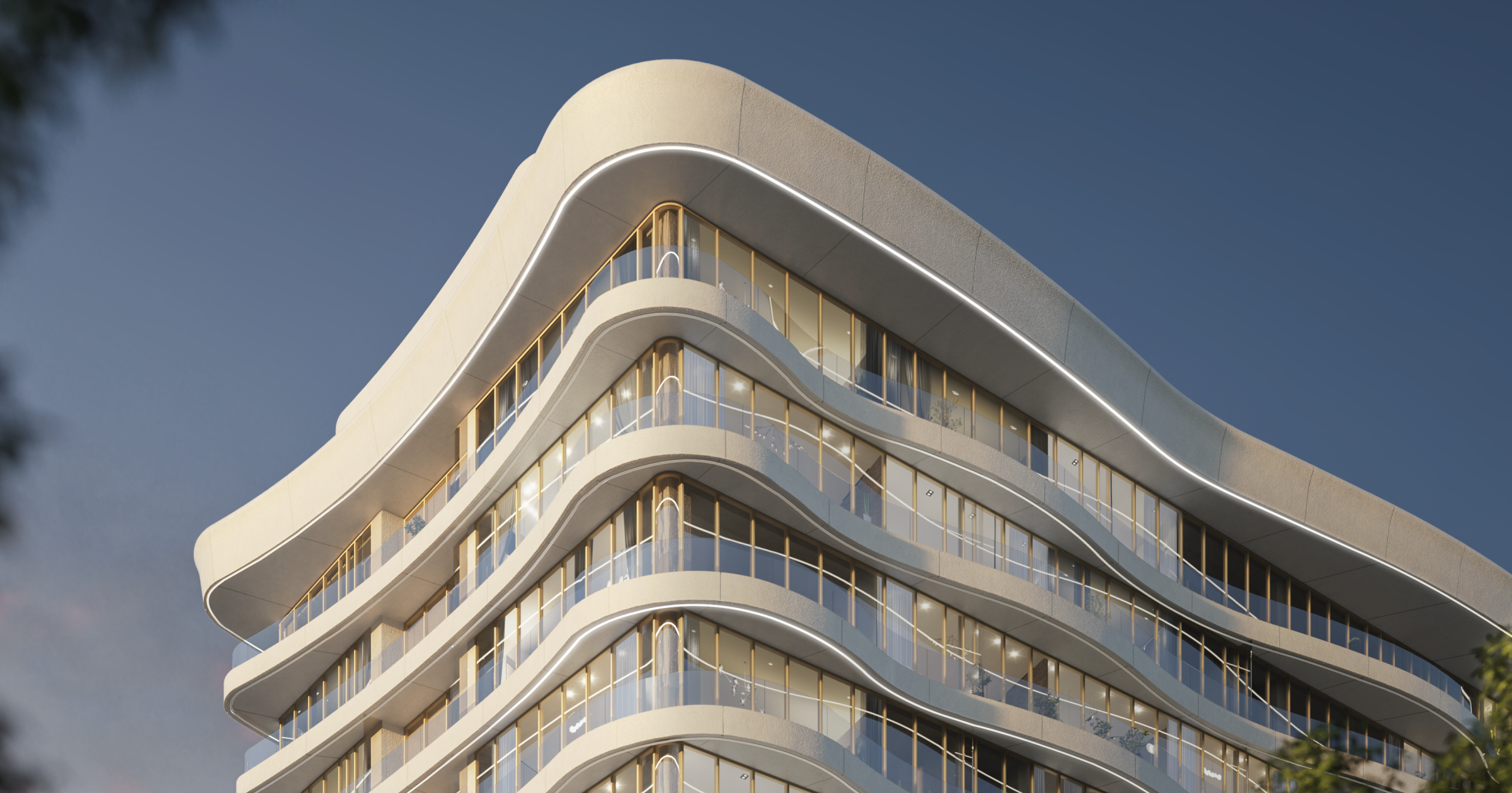 Экстерьер стремится отойти от прямых линий и выполнен в виде перетекающих волн.
